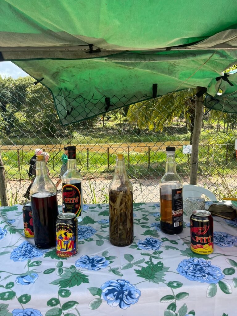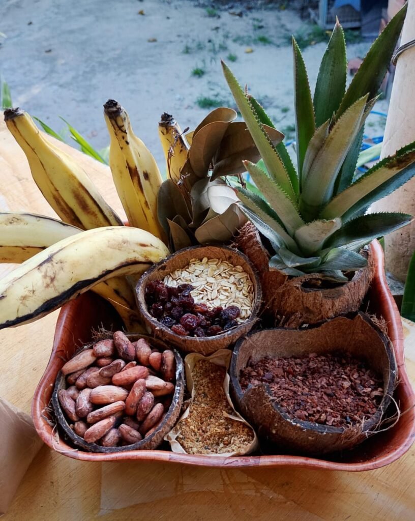 .Azeite de dendê e corante caseiro; .Açafrão; .Folha de Capeba (serve para os rins e fígado); .Coco, Cacau, Cana, Aipim; .Polpa de cupuaçu; .Frutas frescas: Laranja, Limão, Banana, Biribiri, Tamarindo.